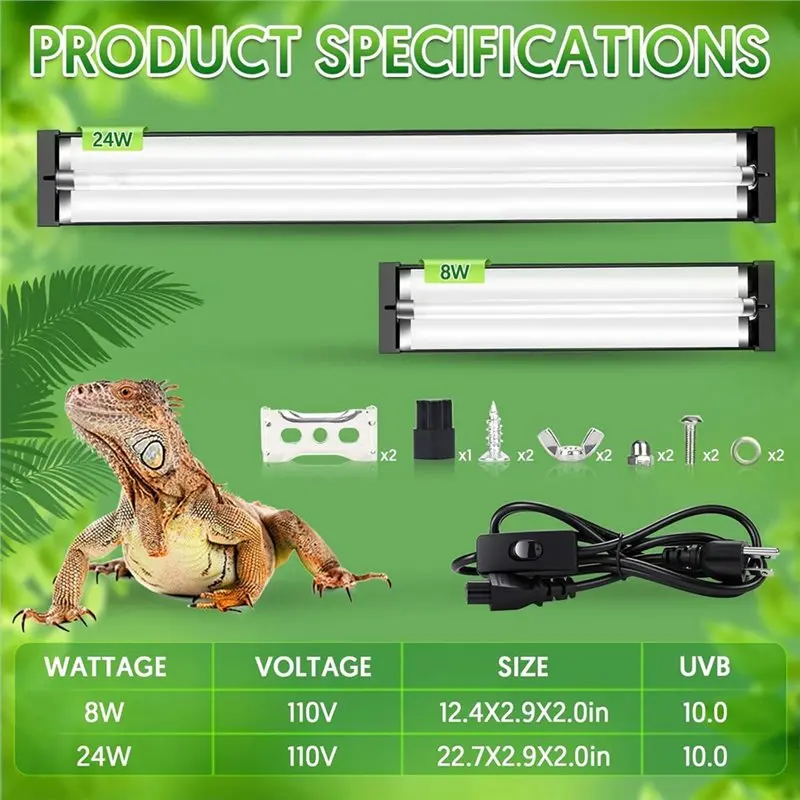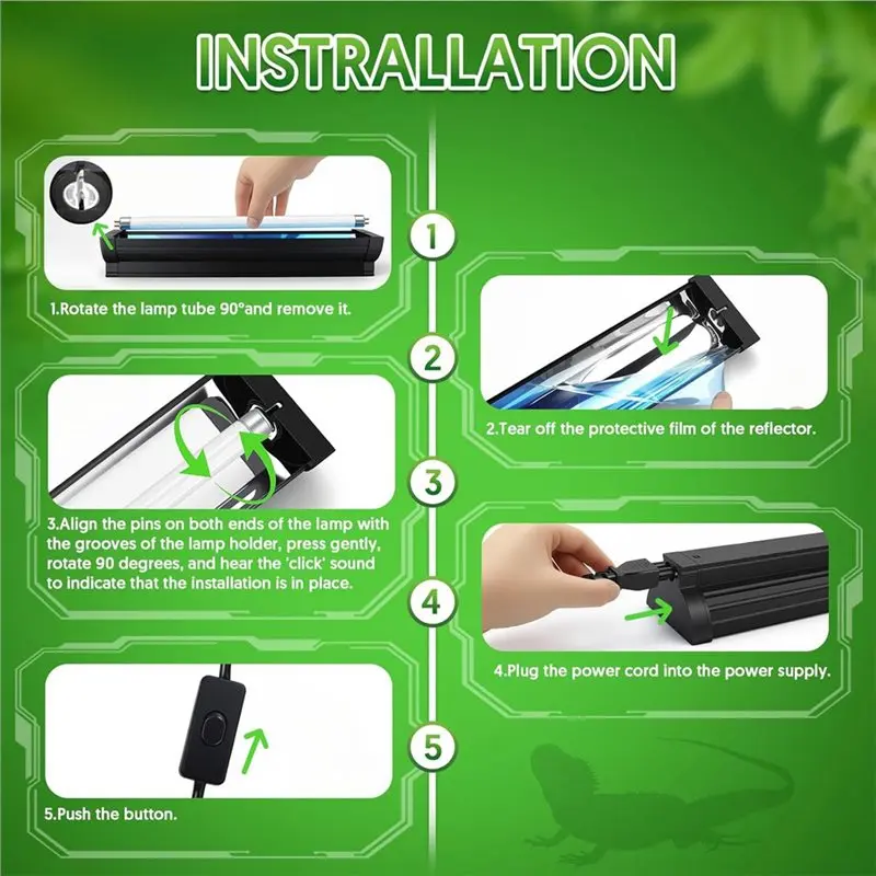 Komplet svetilke za plazilce T5 UVB: Svetilka za plazilce T5 UVB ima 1,6 m dolg snemljiv napajalni kabel, priročno stikalo za vklop/izklop in več dodatkov za montažo za enostavno namestitev.